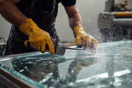 A worker expertly cuts through glass, creating splashes of water in a well-equipped workshop.