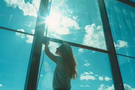 Young woman cleaning large window on sunny day with blue sky background, enhancing natural light