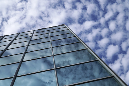 Modern glass facade of an office building, reflection of the sky in the Windows.