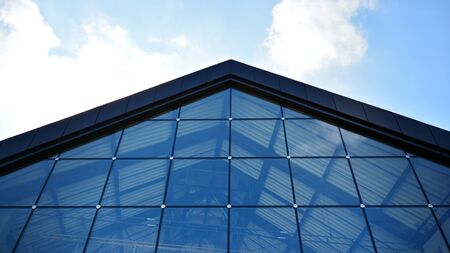 Perspective view of modern futuristic glass building abstract background. Exterior of office glass building architecture. Reflection in transparent glass of business building. Company glass window.