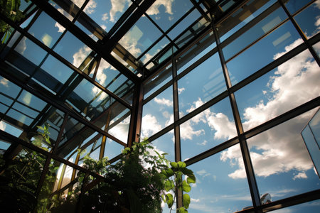 A modern glass building reflecting clear blue sky symbolizes innovation and renewable energy efficiency in urban architecture