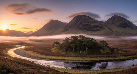 Serene Sunrise Over Scottish Highlands Landscape with River