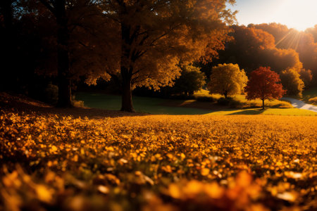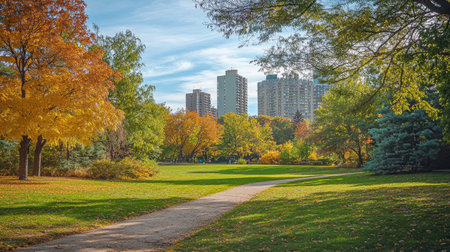 A landscape view of a city park transitioning from the lush greens of summer to the warm tones of autumn