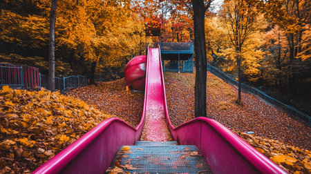 A vibrant pink slide stands out against a backdrop of golden autumn leaves and towering trees in a park. The scene evokes a sense of childhood joy and seasonal beauty.