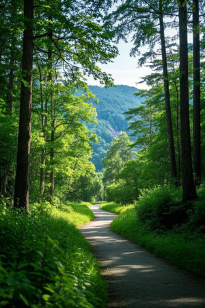 A path winds through a verdant forest, surrounded by tall trees and vibrant foliage. Sunlight filters through the canopy, creating a play of light and shadow. The composition focuses on the natural environment, likely suitable for illustrating themes of nature, travel, or environmental conservation, and various commercial purposes.