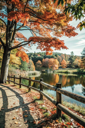 Autumn landscape with lake and wooden fence in the park. Fall season