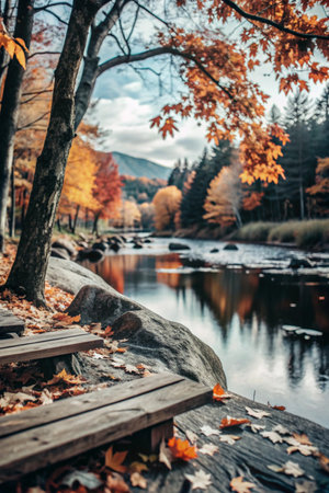 Wooden bench on the shore of a mountain river in autumn.