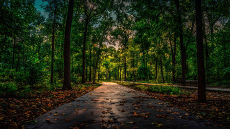 A tranquil forest path illuminated by sunlight filtering through trees at dusk or dawn