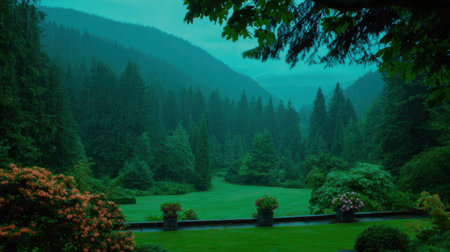 A moody and atmospheric landscape of a lush green garden nestled in a valley surrounded by foggy, tree-covered hills during a tranquil evening.