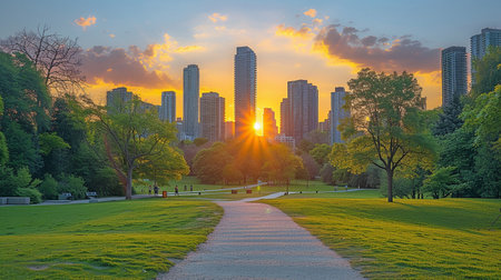 Modern towers may be seen in the backdrop as a green city park is illuminated by sunset.