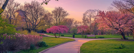 A serene park with flowering trees, a winding path, and a pastel sky.