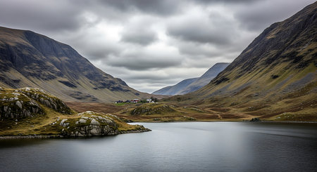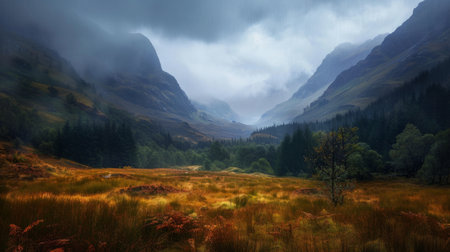 Explore the stunning beauty of dramatic mountains towering over lush green valleys, set against a moody and stormy sky in the captivating Highlands of Scotland.