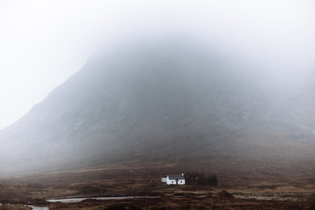 A lonely house under a snow-capped mountain in the Scottish Highland, just off Road A82