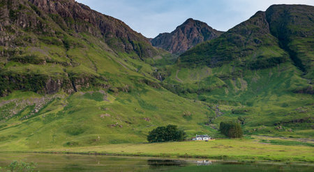 In Lochaber,dwarfed by the majestic mountains along the Valley of Glencoe,the wee picturesque cottage,sits between a clump of trees used by hiking climbers,sitting amongst lush,green summer grass.