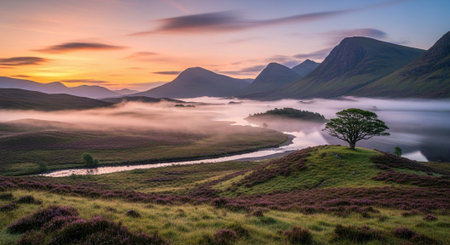 Scenic Scottish Highlands Landscape at Sunrise with Misty Valley
