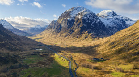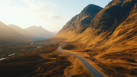 A winding road flows through a breathtaking valley surrounded by majestic mountains, capturing the serene beauty of nature in warm sunset light. Perfect for adventure visuals.