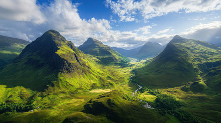 The sun is shining on the green valley of the Glencoe mountains in the Scottish highlands in July