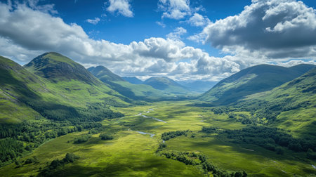 Experience the stunning beauty of a vast green valley enveloped by majestic peaks and bright blue skies, a perfect representation of nature's untouched splendor in the highlands.