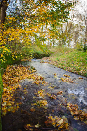 Nature autumn landscape of river flowing through the park.