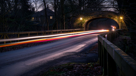 A tering of car light trails les in the distance as they traverse over a quaint oldfashioned bridge in the tranquil countryside