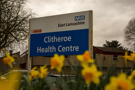 Clitheroe, Lancashire/UK - March 6, 2020: The entrance to Clitheroe health centre with daffodils in the foreground.