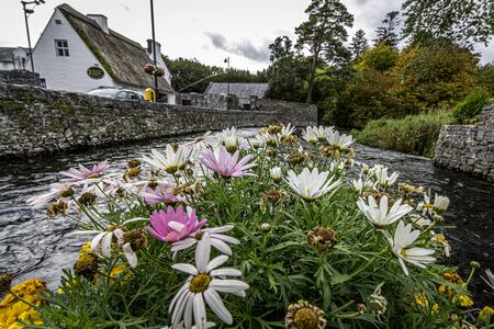 A big bunch of flowers foreground on top of a stream of water with houses on bank.