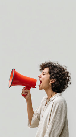 Woman looking at camera while shouting into bright red megaphone. Bold expression in open space with neutral backdrop. Concept of activism, public speaking, social issues.