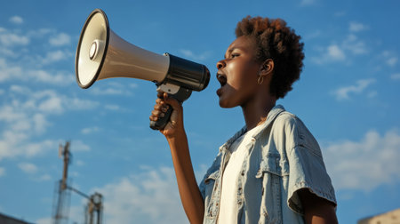 Young woman with afro hairstyle using a megaphone during a protest rally, advocating for social change and making her voice heard in a public demonstration