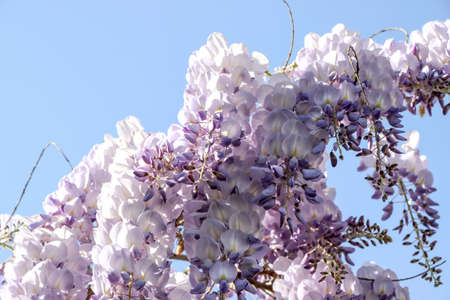 Purple wisteria flowers in spring. Wisteria trellis. Purple flowers on tree.