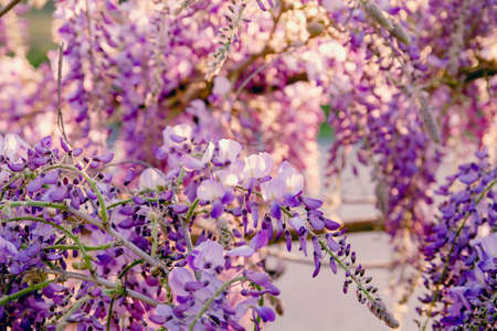 Wisteria flowers are blooming in sunset garden. High quality photo