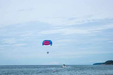 Teluk Bahang, Penang/Malaysia - Mar 08 2020: Aerial parasail at sea.