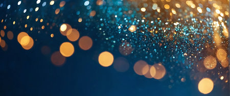Blue and golden sparkling glitter bokeh background, christmas texture. Holiday lights. Abstract defocused header. Wide screen wallpaper. Panoramic web banner with copy space for design