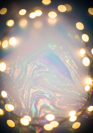 Soft, out of focus bokeh lights in golden yellow and blue tones are scattered across a dark, textured glitter background, with a bright lens flare adding a highlight.