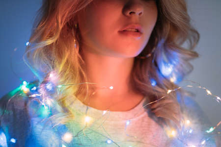 Blond woman with shiny fairy lights in blur rainbow color gradient glow isolated on navy blue background.