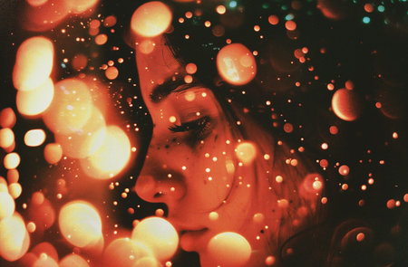 Golden bokeh lights overlay creating a dreamy atmosphere in the background