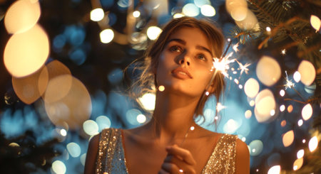 Young Caucasian woman in a snowy winter setting holding a sparkling sparkler. Concept of holiday celebration, Christmas, festive season, joyful moments, New Year.
