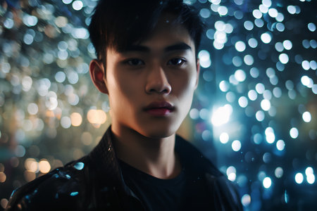 Portrait of Young Man with Cosmic Light Effects and Blue Background.
