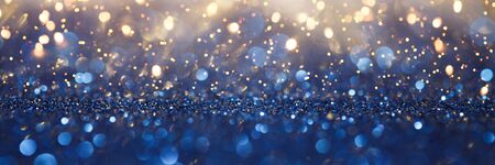 Blue and golden sparkling glitter bokeh background, christmas texture. Holiday lights. Abstract defocused header. Wide screen wallpaper. Panoramic web banner with copy space for design
