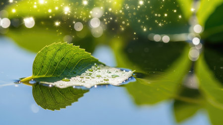 A close-up captures a vibrant green leaf gently floating on water, showcasing visible water droplets. The image employs soft lighting and a shallow depth of field, highlighting the leaf's texture and form. This nature-focused scene is suitable for various commercial uses, including ecological concepts or serene visuals.