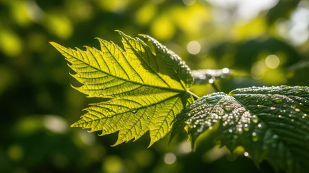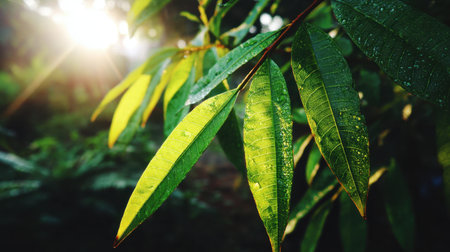 A striking close-up of vibrant green leaves adorned with water droplets, illuminated by soft sunlight in a serene forest, showcasing the freshness and beauty of nature.