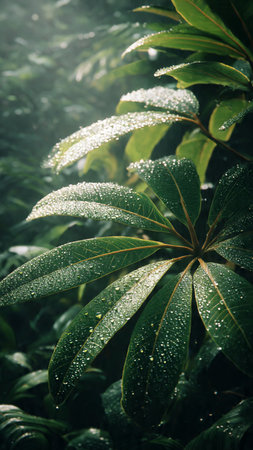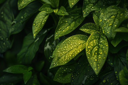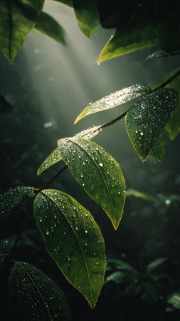 A close-up shot capturing fresh green leaves adorned with glimmering water droplets, creating a serene and vibrant atmosphere ideal for nature lovers and enthusiasts.