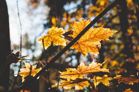Leaves of a tree in the autumn forest illuminated by the sun