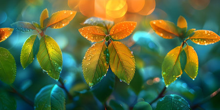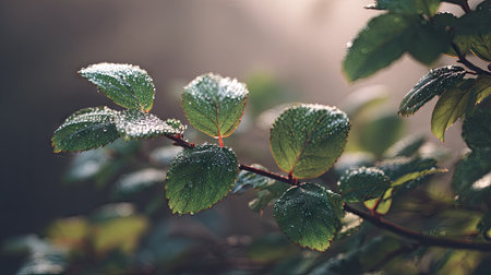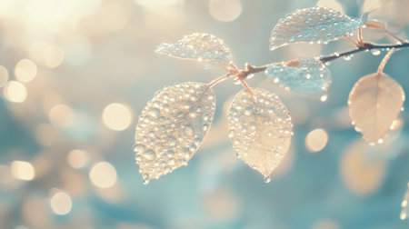Delicate leaves adorned with glistening dew drops, set against a dreamy bokeh background. Perfect for themes of nature, freshness, and tranquility.
