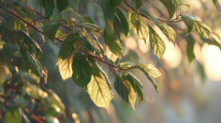 AI Generated. A leafy green tree branch with leaves that are shining in the sunlight