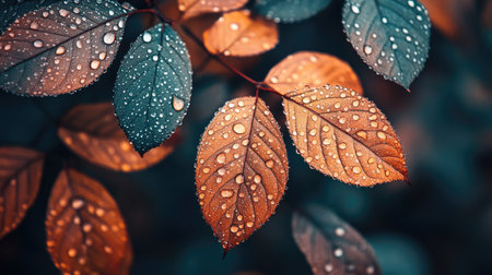 AI Generated. Dewdrops Adorn Vibrant Autumn Leaves Branch