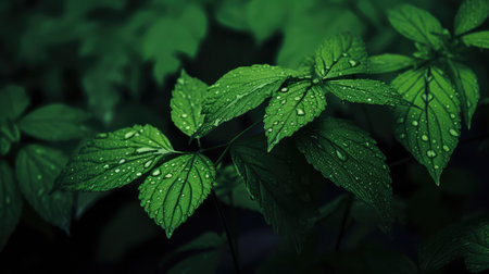 Captivating close-up shot of dewy green leaves with water droplets, set against a dark backdrop, exemplifying the beauty of nature and tranquility.