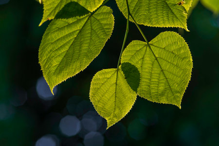 Linden tree tea nature Young green leaves background foliage Greenery close up Abstract morning sunlight Wallpaper lime Tilia americana Botany pattern Texture macro twig. Small-leaved Lime Tilia cordata,