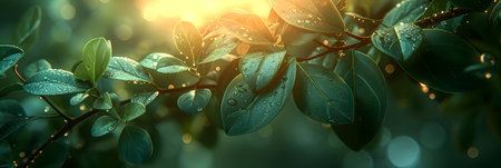 A Lush green leaves illuminated by warm sunlight, creating serene and natural atmosphere with soft bokeh in background
