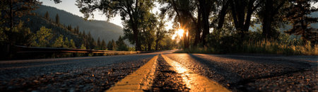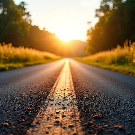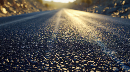 An asphalt road extends into the distance, framed by hills and illuminated by a setting sun. The composition features a low-angle perspective, highlighting the road's texture and the natural gradient of the sky. The warm colors suggest a tranquil outdoor setting, suitable for commercial or editorial applications.