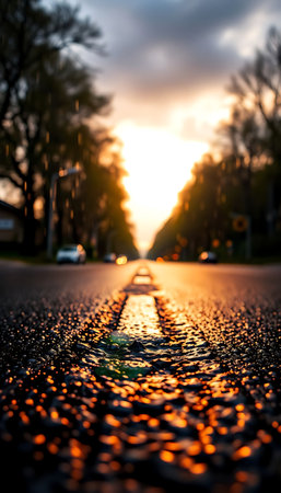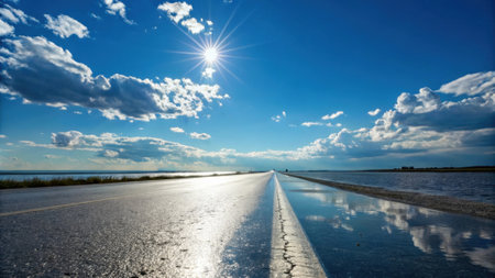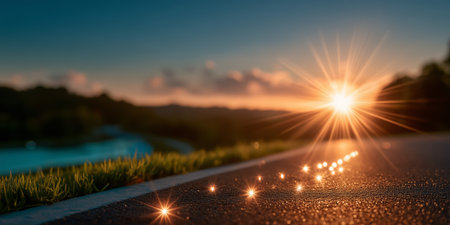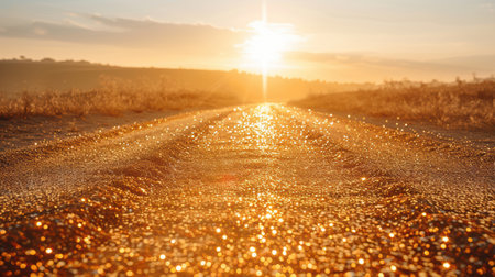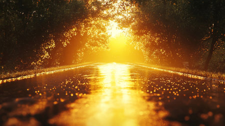 A breathtaking sunset illuminates a tranquil road with sparkling reflections on the surface